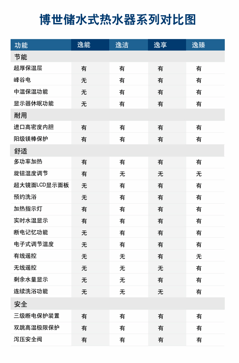 熱水器提供1000W/2000W/3000W三種輸入功率供選擇,用戶可根據(jù)實(shí)際使用需要選擇不同加熱功率,即提高加熱速度,又避免不必要的能源浪費(fèi)。