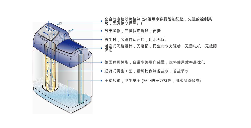 d、省鹽、效率高,自動記憶客戶用水量及用水習(xí)慣,與客戶使用習(xí)慣相匹配的再生使用計(jì)算,能夠使機(jī)器處于最佳有效的高效運(yùn)轉(zhuǎn)狀態(tài)。逆流再生設(shè)計(jì),省鹽、省水效果好,再生時(shí)補(bǔ)水,平時(shí)鹽箱無水設(shè)計(jì),衛(wèi)生安全。排水部分獨(dú)特防溢閥設(shè)計(jì),避免排污虹吸引起的二次污染。桶底外加水路導(dǎo)向裝置,使濾料使用效率最大化,效果最好。