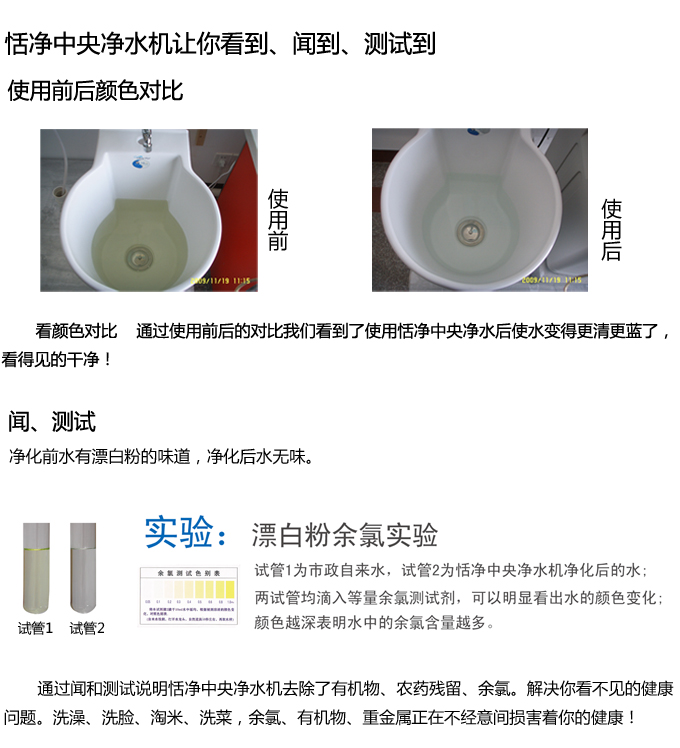全自動(dòng)中央凈水機(jī)有效去除水中的異色、異味;進(jìn)一步濾除水中微小雜質(zhì)、膠狀體;去除水中的漂白粉余氯、農(nóng)藥、重金屬;保留對(duì)人體有益的礦物質(zhì)。使水變得碧清、碧藍(lán),去除對(duì)人體有害的物質(zhì)。