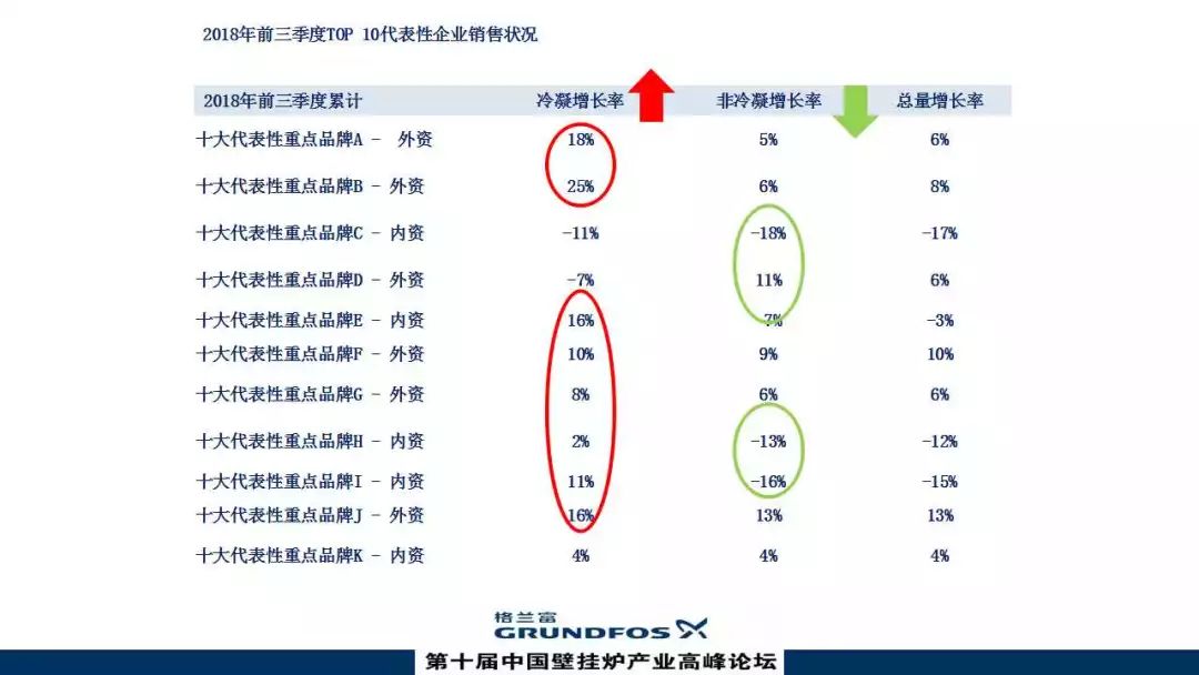 紅色是2018年整個壁掛爐,包含“煤改氣”產(chǎn)品的銷量,基本在350~400萬臺。前三季度銷量前十的企業(yè)本來我是想把品牌名列出來的,但佰世越?jīng)]有所有權(quán),所有權(quán)歸我們客戶??蛻艚ㄗh把外資、內(nèi)資列出來,可以參考。